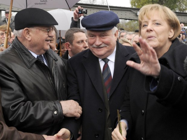Me një shëtitje simbolike përgjatë ish pikës kufitare Bornholmer Strasse, kancelarja Angela Merkel (CDU) me Mikhail Gorbachev (l) dhe ish-sindikalistin polak dhe presidentin Lech Walesa (M) përkujton rënien e Murit 20 vjet më parë në Berlin në nëntor. 9, 2009.