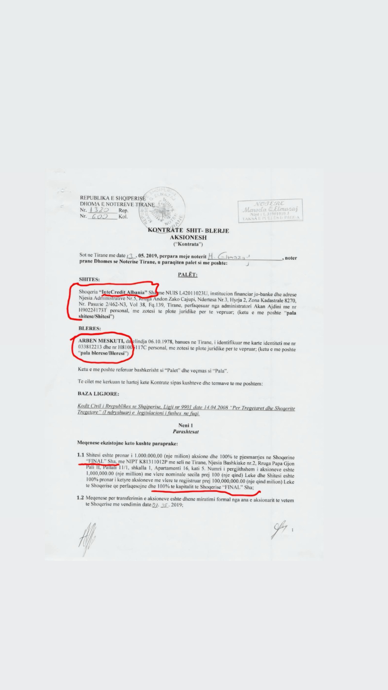 Pasi gjeten nje oligark estonez per te vene ne jete skemen me mikrokredi, ne vitin 2018 Oligarku Mane me Balfin fillojne operacionin. Ne fillim ia shesin kuotat Iutecredit Albania me administrator Akan Ajdin. Ne fakt veprimi ishte TRANSFRIM pa para nga Balfin te Iute. Ne 2019 aksionet e Finalit, Akan Ajdini ia transferon Arben Meskutit, per 1 miliard leke. Meskuti s’kishte si te deklaronte aq para ndaj u sajua nje marifet financiar sikur po lahej nje borxh i vjeter i Finalit ndaj Iutes (borxhi i Oligarkut) keshtu Meskuti u be pronar i Final pa paguar asnje lek.
