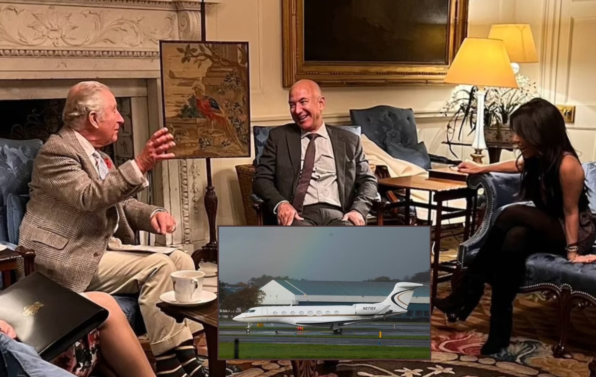 Bezos shihet me një buzëqeshje të madhe ndërsa trashëgimtari i kurorës britanike bën disa gjeste pranë një filxhani çaji që është vendosur në një tavoline të vogël, ndërsa Sanchez përkulet përpara, duke dëgjuar me vëmendje.