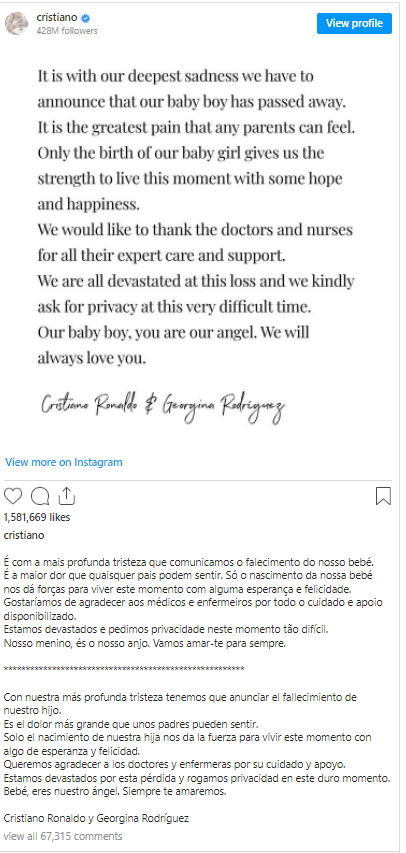 Sulmesi portugez Cristiano Ronaldo nëpërmjet një postimi në Instagram ka dhënë lajmin e hidhur se ka humbur një nga binjakët që priste të sillte në jetë partnerja e tij Georgina Rodriguez.