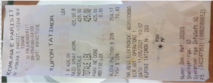 Ja kam ketu edhe faturen qe e bleva 4500 lek dhe nuk me dha asnje efekt. Asnje mize nuk ngordhi. Pra eshte i skaduar, se edhe e mora per insekte qe nuk fluturojnë…”