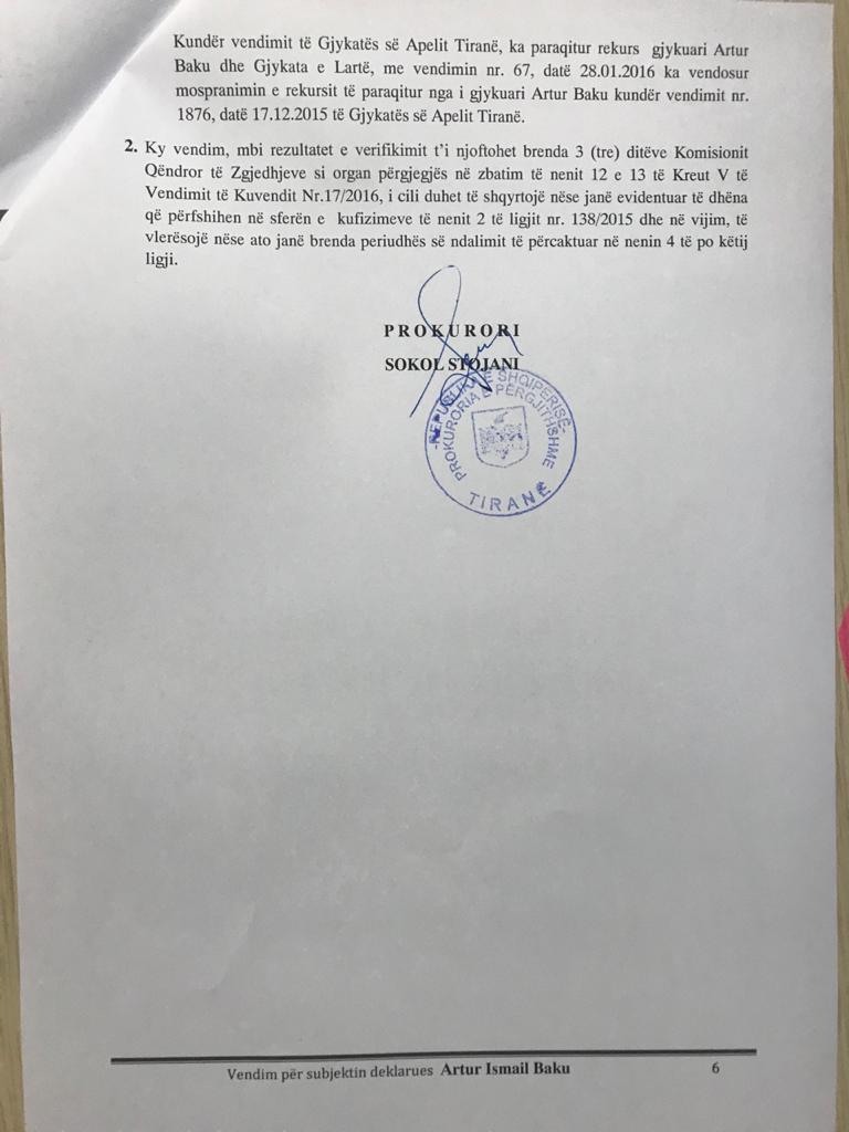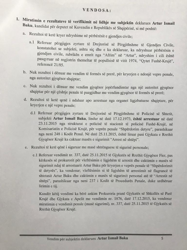 Kandidati i LSI-së, Artur Baku, ka rezultuar pas verifikimit nga Prokurorinë e Përgjithshme që të ketë ndryshuar emrin. Sipas vendimit thuhet se Baku e ka ndryshuar emrin nga “Afrim” në Artur. Këtë gjë, Baku e ka deklaruar edhe në formular.