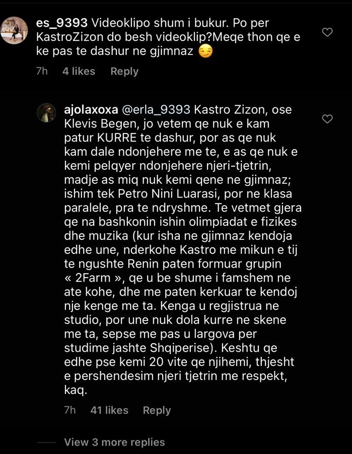 Ajo sqaron më tej se me Kastron jo vetëm që nuk kanë qenë kurrë të lidhur, por as nuk e kanë pëlqyer ndonjëherë njëri-tjetrin, dhe mes të dyve qëndron thjesht një respekt reciprok. “Videoklipi shumë i bukur. Po për Kastro Zizon do bësh videoklip? Meqë thon që e ke pas të dashur në gjimnaz”, i shkruan një ndjekëse në koment.