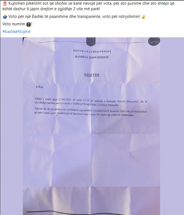 Kandidati i koalicionit “Bashkë Fitojmë” për Bashkinë e Rrogozhinës ka publikuar një denoncim për rivalin e tij Edison Memolla. Në rrjetin e tij social, Shkëlqim Hoxha ka publikuar një letër ku njoftohet një takim i kryebashkiakut me përfituesit e granteve të rindërtimit pas tërmetit të vitit 2019.