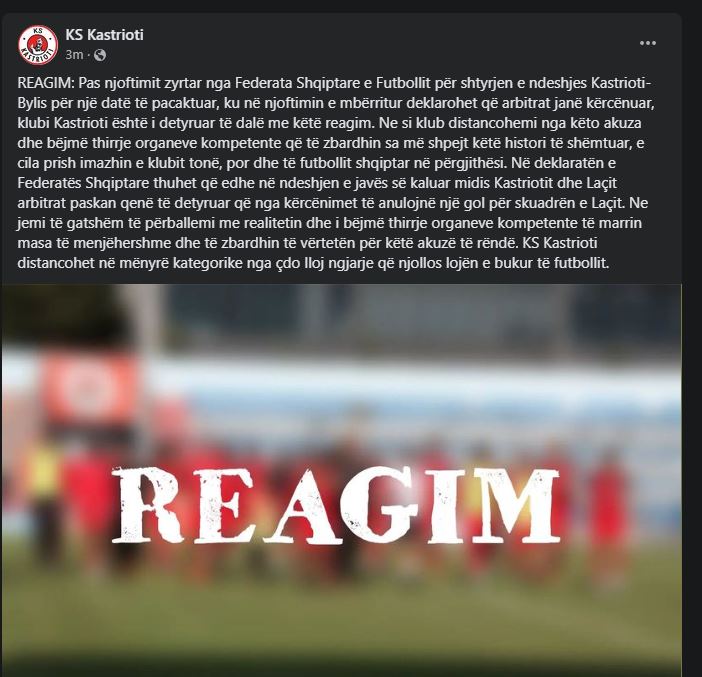 Klubi i Kastriotit ka dalë me një reagim publik në lidhje me situatën e krijuar me krutanët të cilët akuzohen se kanë kërcënuar gjyqtarët për të marrë vendime në favor të tyre. FSHF anuloi ndeshjen e sotme të tyre ndaj Bylisit teksa priten vendime të komisioneve disiplinore apo edhe organeve të rendit pasi çështja ka shkuar në Policinë e Shtetit.