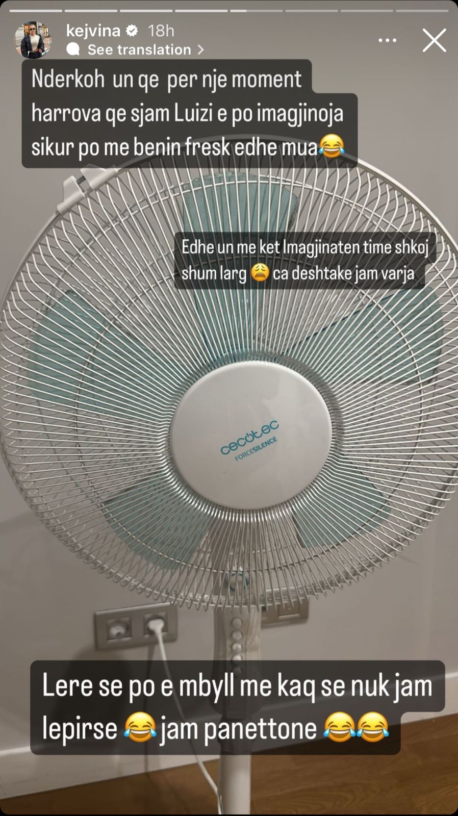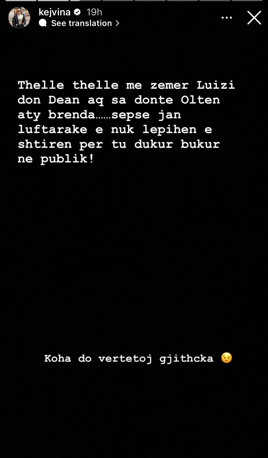 “Thellë-thellë me zemër Luizi do Dean aq sa donte Oltën aty brenda… sepse janë luftarake e nuk lëpihen e shtiren për t’u dukur bukur në publik. Koha do vërtetojë gjithçka. Ndërkohë unë për një moment harrova që nuk jam Luizi e po imagjinoja sikur po më bënin fresk dhe mua. Edhe unë me këtë imagjinatën time shkoj shumë larg, ça dështake jam. Lëre se po e mbyll me kaq se nuk jam lëpirse”,– shkruan Kejvina.