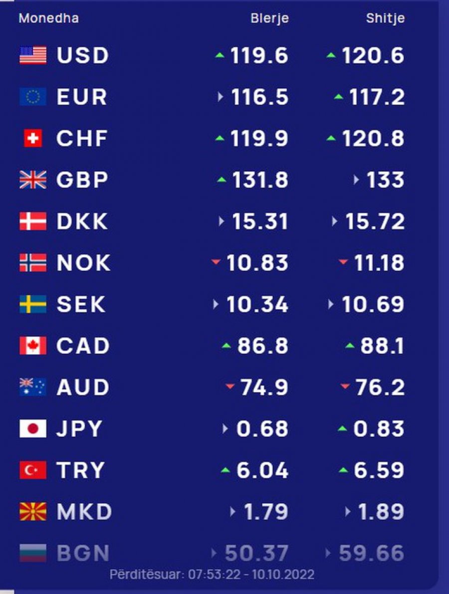 Euro blihet me 116.5 lekë dhe shitet 117.2 lekë. Paundi britanik sot blihet me 131.8 lekë dhe shitet me 133 lekë.