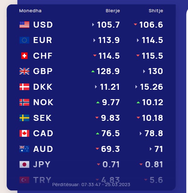 Euro sot do blihet me 113.9 lekë dhe do shitet me 114.5 lekë, ndërsa franga zvicerane do blihet me 114.5 lekë dhe do shitet me 115.5 lekë.