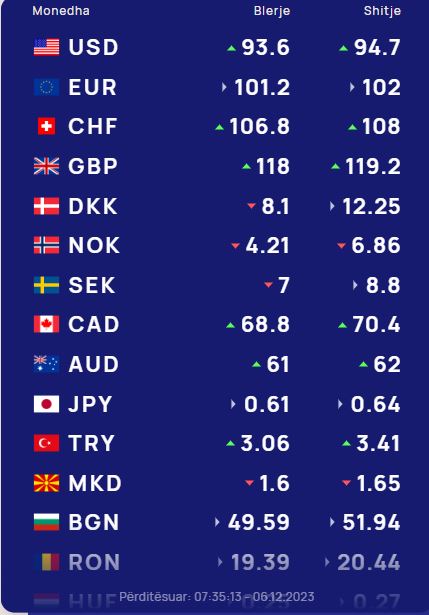 Monedha evropiane euro do blihet me 101.2 lekë dhe do shitet me 102 lekë, ndërsa franga zvicerane do blihet me 106.8 lekë dhe do shitet me 108.