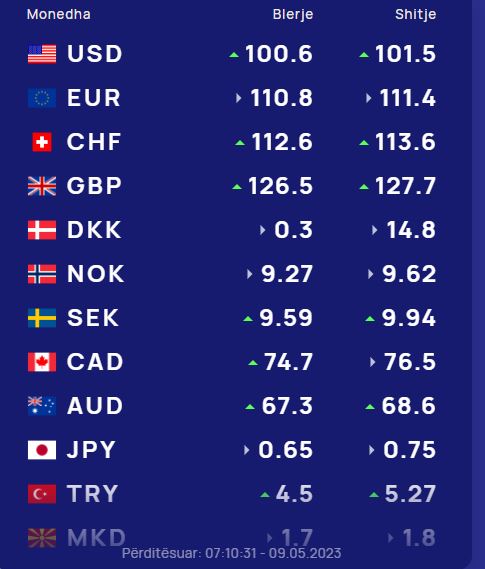 Franga zvicerane do të blihet me 112.6 lekë dhe do të shitet me 113.6 lekë. Ndërsa paundi britanik do blihet me 126.5 lekë dhe do të shitet me 127.7 lekë.