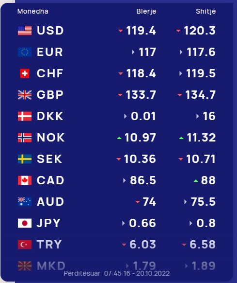 Dollari amerikan është blerë këtë të enjte, 20 Tetor me 119.4 lekë dhe është shitur me 120.3 lekë sipas kursit të këmbimit, duke treguar dobësim.