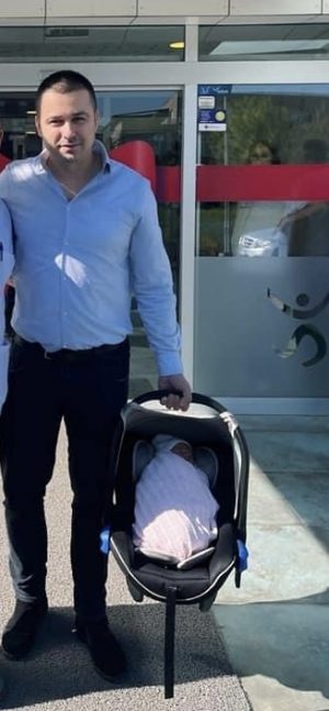 Fotot janë realizuar gjatë momentit që Eni dhe vajza e saj kanë lënë spitalin. Foshnja e tyre duket në një soxholino, të cilin e mban këngëtari në dorë.