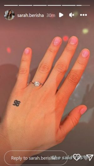 Sarah Berisha duket se do të presë shumë gjatë për një propozim nga partneri i saj Dj Pm. Blogerja na bëri lëmsh mbrëmjen e djeshme, teksa ndau një foto ku dukej dora e saj me një unazë në gishtin e fejesës. Jo vetëm kaq! “Ajo tha po,”-shkruante Berisha krahas imazhit.