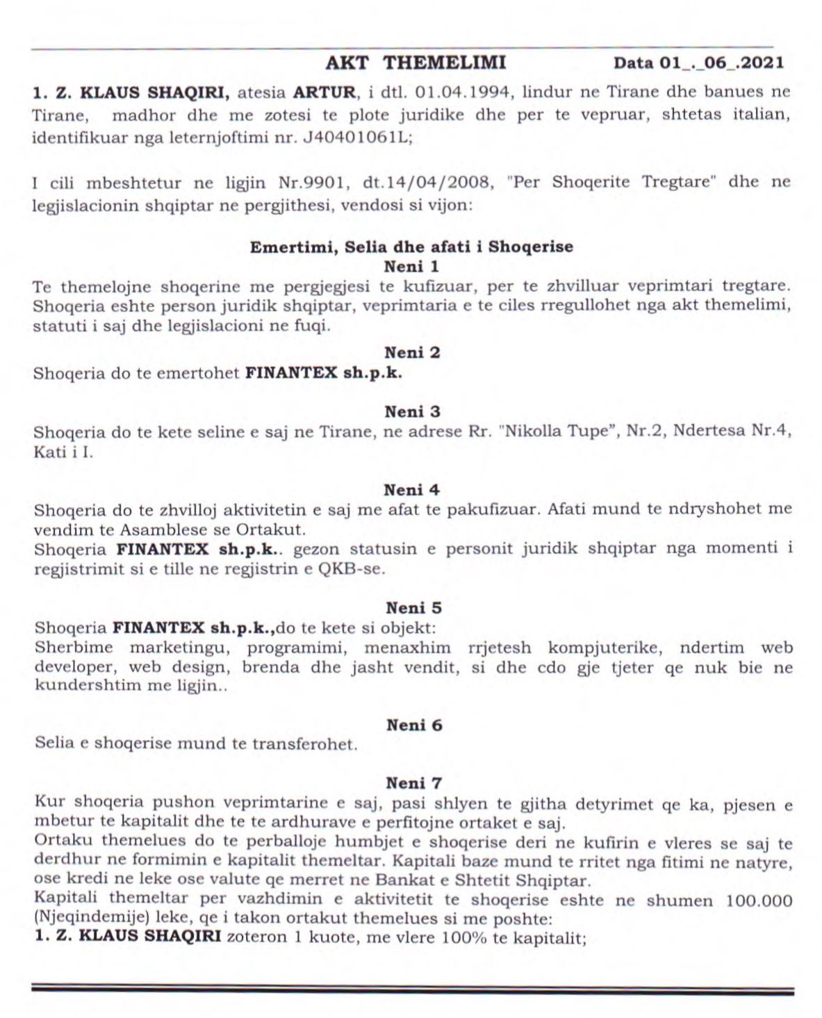 Në datën 1 qershor 2021 një kompani e re u regjistrua në regjistrin tregtar shqiptar. Kompania “Finantex” me nipt M11803035A ka si aktivitet të deklaruar: “Shërbime marketing, programimi, menaxhim rrjetesh kompjuterike, ndërtim ëeb developer, ëeb design, brënda dhe jashtë vendit, si dhe çdo gjë tjetër që nuk bie në kundërshtim me ligjin”. Administrator dhe ortak i vetëm i shoqerisë është shtetasi Klaus Shaqiri.