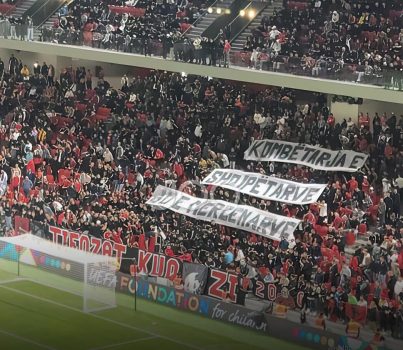 Përpara këtij momenti, TKZ shpalosën edhe një banderolë me një mesazh të qartë: “Kombëtarja e shqiptarëve, jo e mercenarëve”.