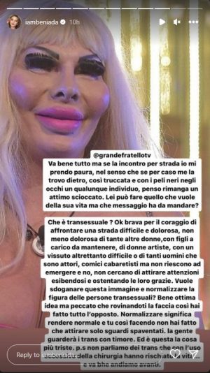 Në një tjetër postim Beniada ka një mesazh për “Grande Fratello Vip”, për konkurenten e re. Modelja shqiptare shkruan se nëse do të shikonte një njeri të tillë në rrugë “do të frikësohej dhe do të traumatizohej”. Më tej ajo vijon shpjegimin e saj duke shkruar: