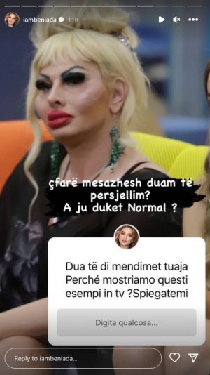 Fillimisht krahas një fotoje të konkurentes së “BBV Italia”, Beniada pyet ndjekësit: “Çfarë mesazhi duam të përcjellim? Ju duket normale? Pse i tregojmë këto shembuj në televizion?”