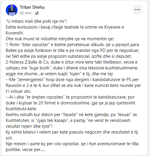 Nëpërmjet një postimi në rrjete sociale, deputeti i PD-së, Tritan Shehu pohon se ajo që ndodhi sot në kryesinë e kuvendit ishte një shfaqjeje teatrale sepse Alibeaj kishte marrë rolin opozitës.