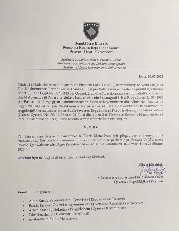 “Andaj, sot me datë 03 maj 2023, kam marr vendim për lirimin nga detyra të anëtarëve të këtij ekipi menaxhues, në përbërje të Danijela Vujiqiq, Jelena Bolovic, Igor Kalamar dhe Dejan Radojkoviç”, ka shkruar Krasniqi.