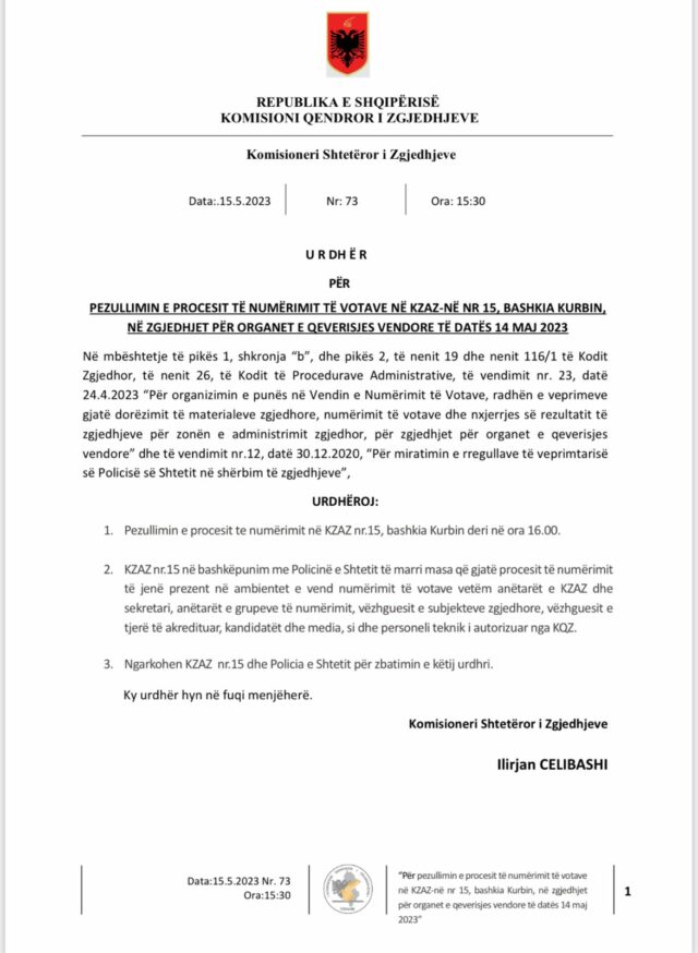 Urdhri është firmosur nga kreu I KQZ, Ilirjan Celibashi.