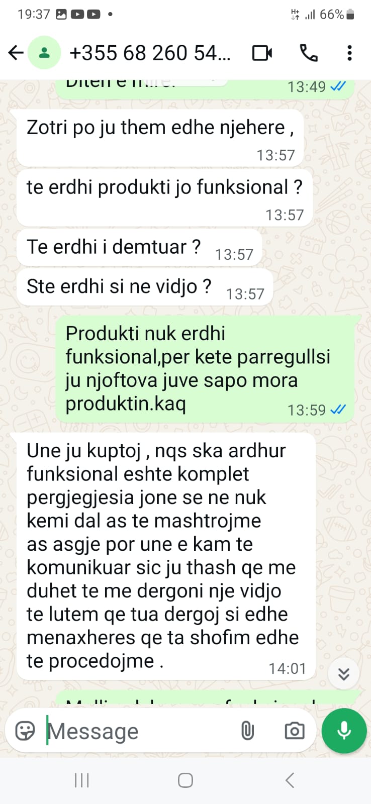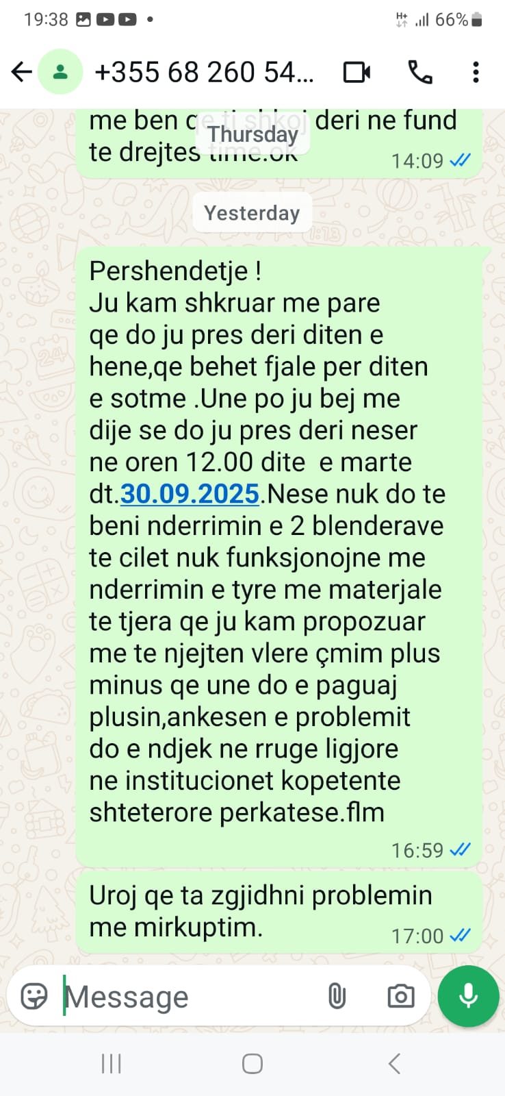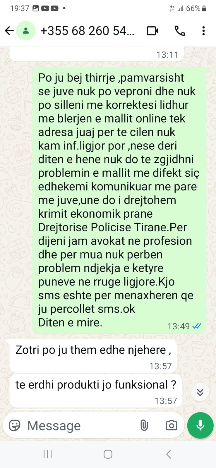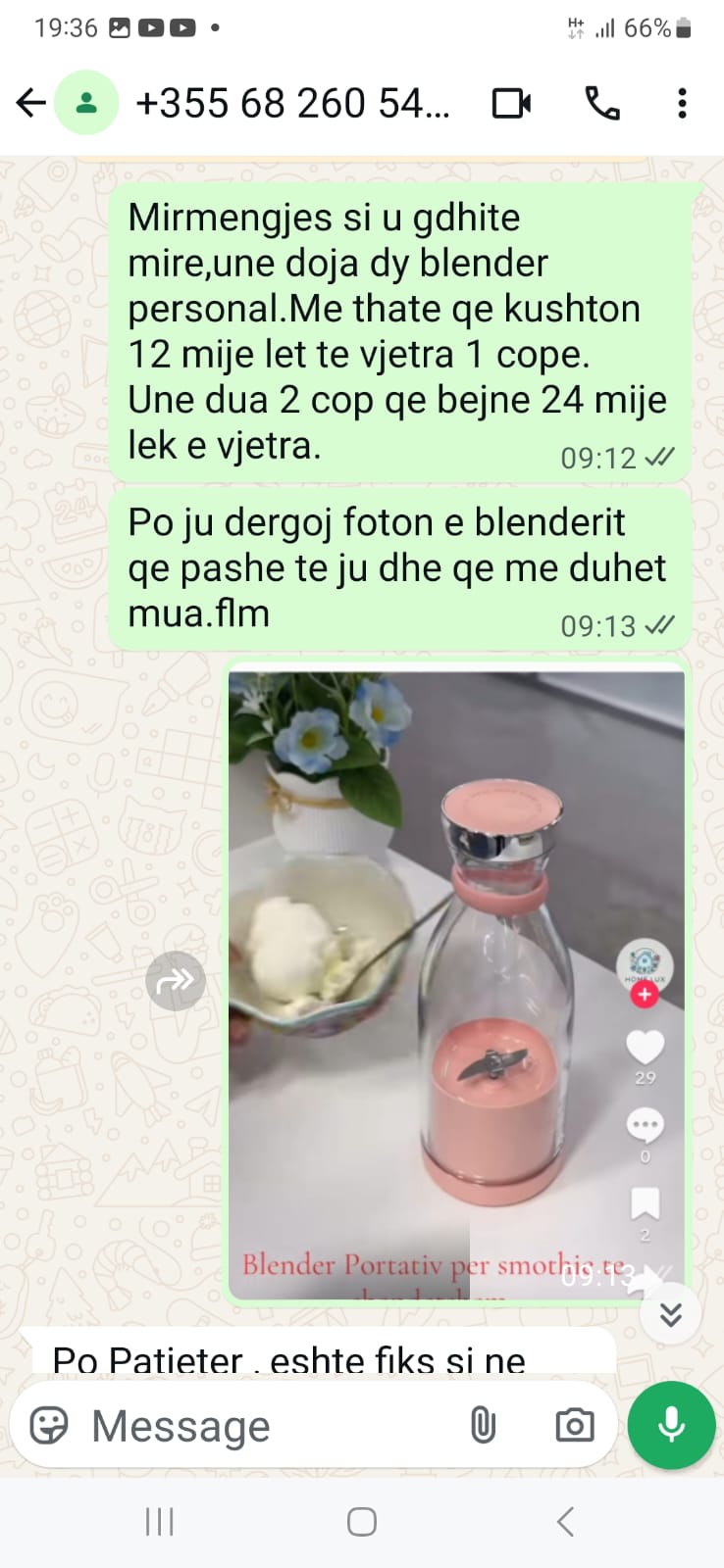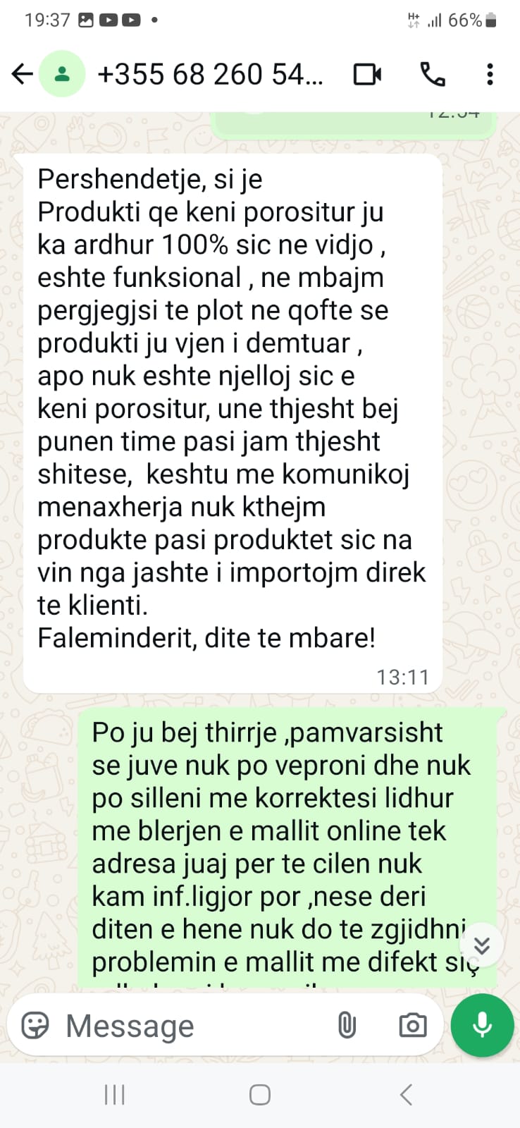Në faqen e tij para pak ditësh një klient ka porositur dy blendera, siç faktohet edhe nga bisedat. Porosia i ka vajtur në shtëpi, me të vetmin problem. që produktet nuk punonin. Në këto kushte, klienti ka kërkuar jo lekët mbrapsht, por zëvëndësimin e produkteve që nuk punonin me dy produkte të tjera, madje ishte I gatshëm të shtonte dhe diferencën për produktet e reja që do porosiste. Dhë përse klienti duhet të porosiste dy produkte të tjera e madje të shtonte edhe lek, kur dy produktet e para nuk punonin? Sepse sipas zonjushës që fliste ëmbël në telefon, kjo ishte “politikë e kompanisë” dhe urdhër i menaxheres.