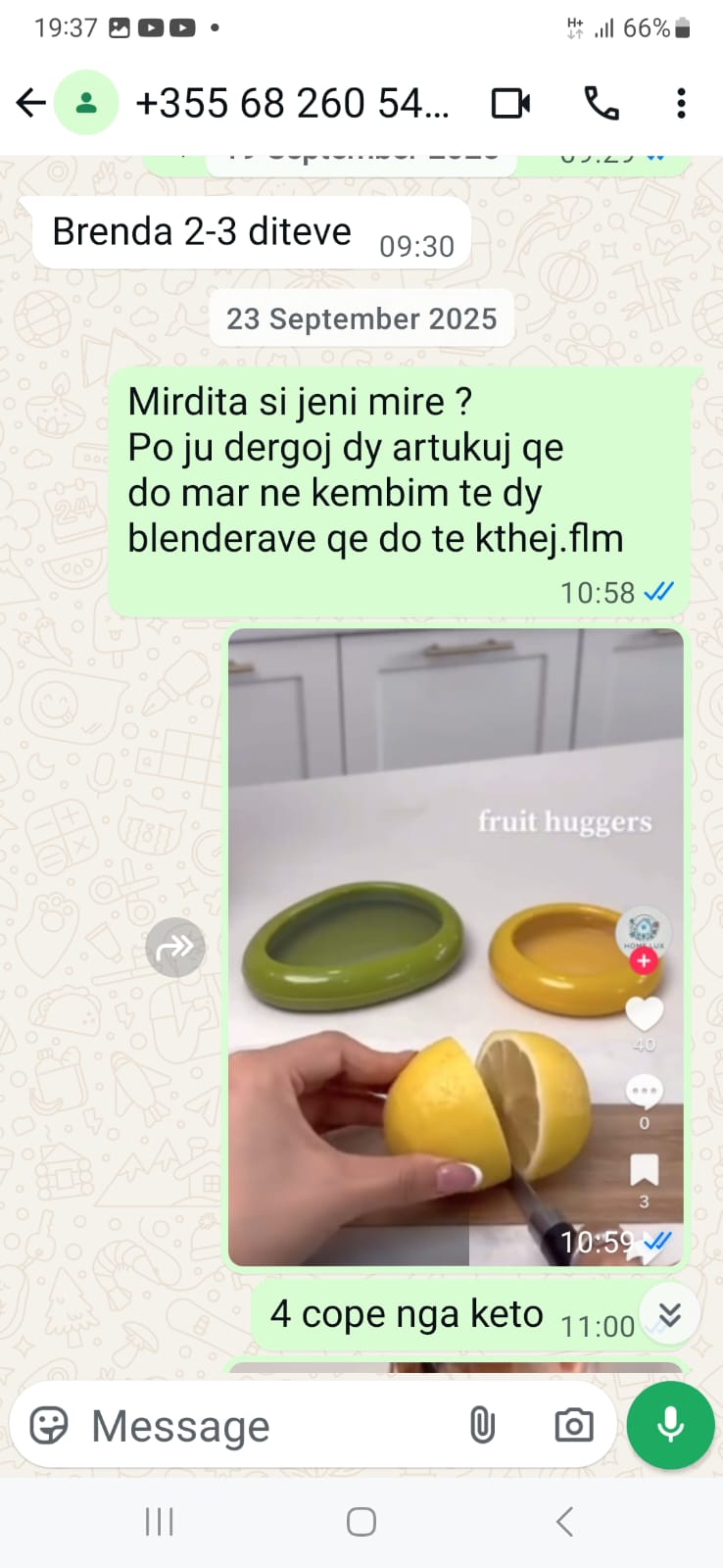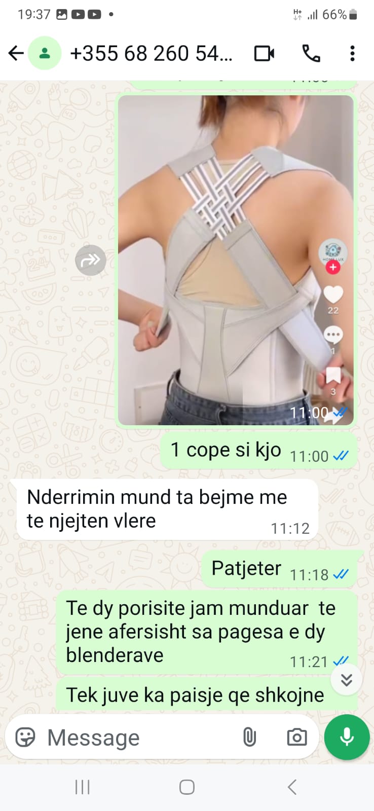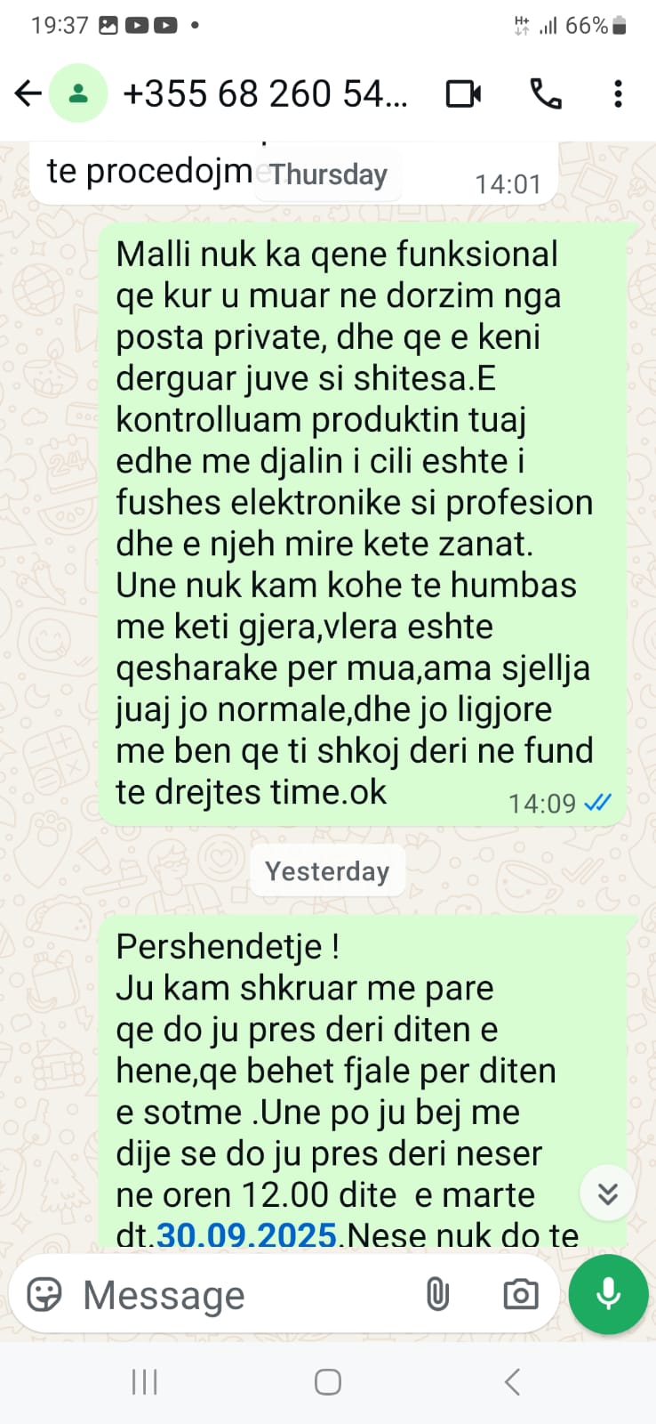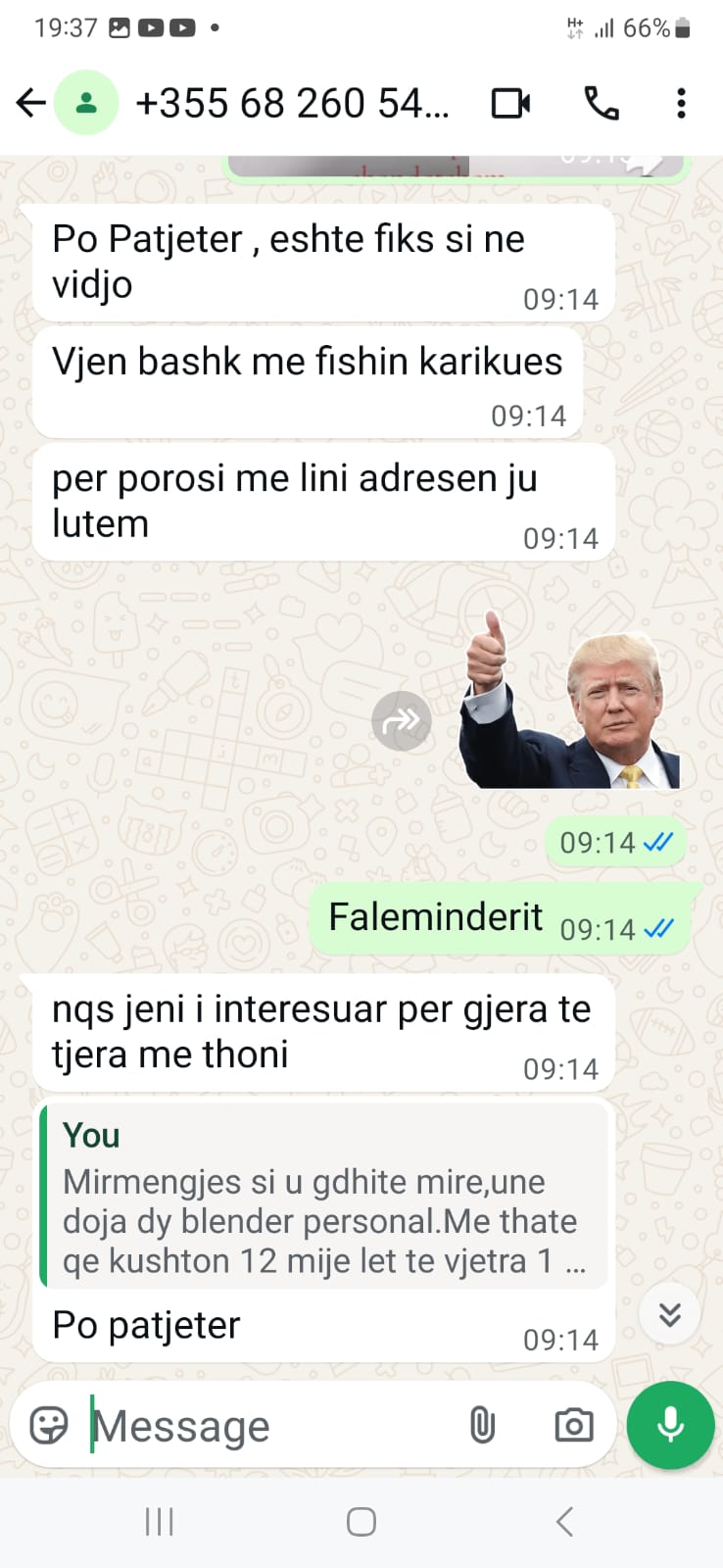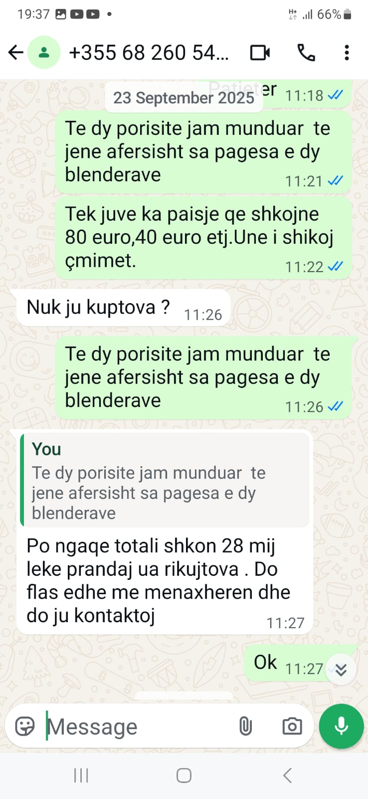 Në faqen e tij para pak ditësh një klient ka porositur dy blendera, siç faktohet edhe nga bisedat. Porosia i ka vajtur në shtëpi, me të vetmin problem. që produktet nuk punonin. Në këto kushte, klienti ka kërkuar jo lekët mbrapsht, por zëvëndësimin e produkteve që nuk punonin me dy produkte të tjera, madje ishte I gatshëm të shtonte dhe diferencën për produktet e reja që do porosiste. Dhë përse klienti duhet të porosiste dy produkte të tjera e madje të shtonte edhe lek, kur dy produktet e para nuk punonin? Sepse sipas zonjushës që fliste ëmbël në telefon, kjo ishte “politikë e kompanisë” dhe urdhër i menaxheres.