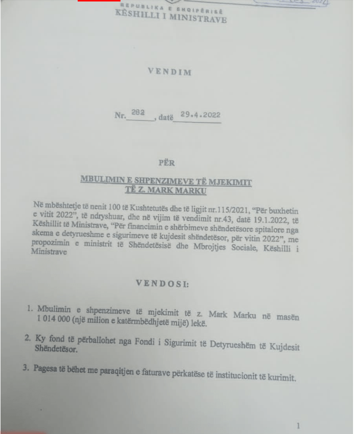 Në vendimin e firmosur nga zëvendëskryeministri Arben Ahmetaj, shkruhet se këto para do të shkojnë për mbulimin e shpenzimeve për mjekimin e Mark Markut, pasi ka bërë një ndërhyrje në zemër pranë një spitali privat në kryeqytet.