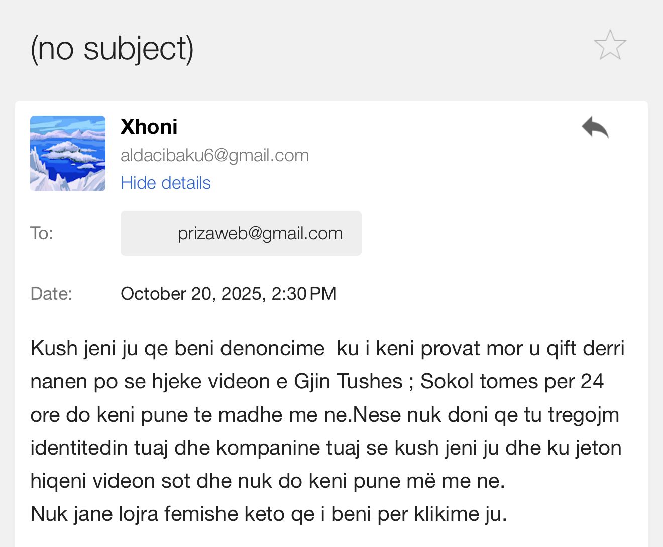 Kjo është fabula e artikullit të djeshëm të publikuar nga ana jonë. Ditën e sotme, në adresën e emailit [email protected] na vjen emaili i mëposhtëm