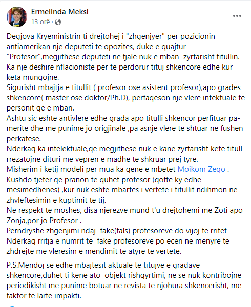 Ndërkohë, shprehet se në respekt të moshës Rama mund t’i drejtohej me termin “Zoti” por jo Profesor, përndryshe zhgënjimi i profesorëve do të rritet.