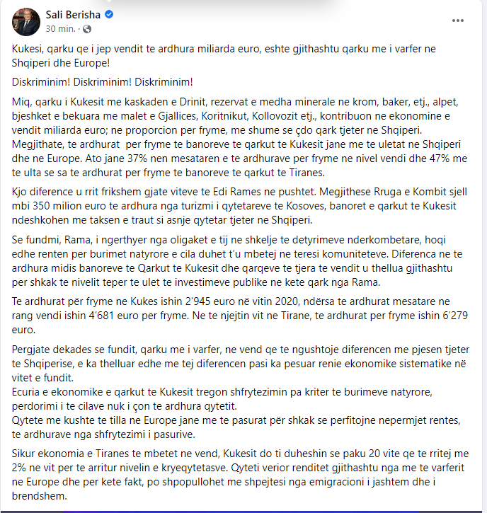 Kryetari i PD-së, Sali Berisha ka reagur në lidhje me statistikat e fundit, ku pavarësisht se Kukësi është qarku i cili i jep vendit të ardhura miliarda euro, por sërish mbetet qarku më i varfër.