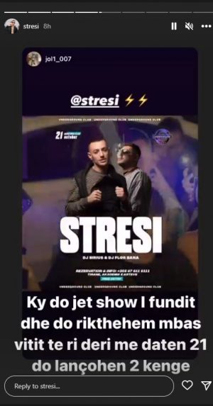 Reperi i njohur, Stresi ka publikuar së fundmi një postim në ‘InstaStory’, ku bën me dije se do të zhvillojë dhe koncertin e tij të fundit e më pas do të kthehet më vonë në skenë. “Ky do të jetë show i fundit dhe do të rikthehem mbas Vitit të Ri deri në datën 21 do lançohen 2 këngë.”– shkroi Stresi. Mirëpo, pse ky vendim nga reperi?