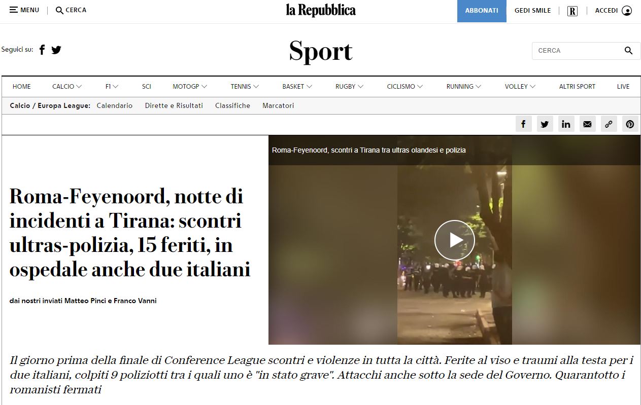 Titulli i La Repubblica:Romë-Feyenoord, nata e aksidenteve në Tiranë: Përplasje ultrapolicie, 15 të plagosur, dy italianë gjithashtu në spital