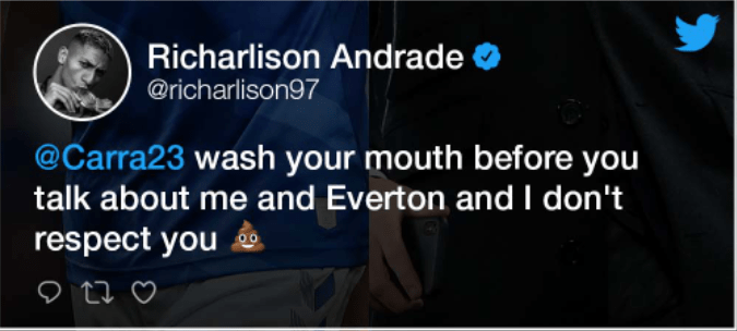 Braziliani kontribuoi për të shmangur rënien e Everton nga Premier League me një fitore mahnitëse kundër Crystal Palace të enjten mbrëma dhe disa orë ai ka shkuar në Twitter dhe ka shkruar kundër Carragher.
