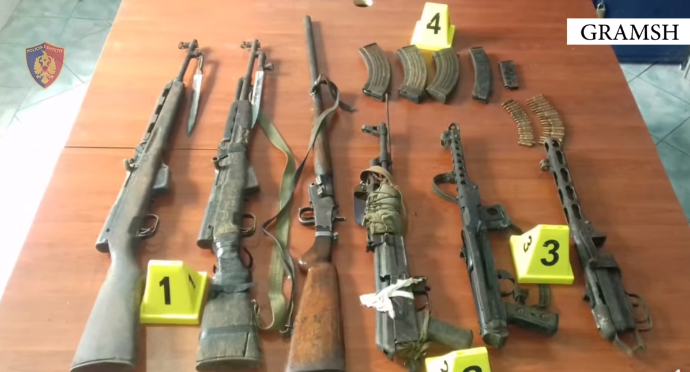 Policia gjen në banesën e kësaj familjeje dhe sekuestron një arsenal armësh të përbërë nga 5 armë zjarri, 1 armë gjahu dhe municion luftarak.