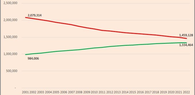 Në fund të vitit 2021, popullsia deri në 39 vjeç zinte 52% të totalit, nga 68% në vitin 2001, duke u tkurrur me gati 16 pikë përqindje.