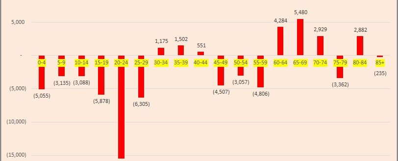 Në krahasim me vitin 2001, grup-mosha 20-24 vjeç ka rënë me gati 12%. Tkurrja më e lartë e popullsisë së të rinjve 20-24 vjeç ka nisur pas vitit 2015, në një linjë me rikthimin e ciklit të emigracionit, që u reflektuar në rritjen e kërkesave për azil.