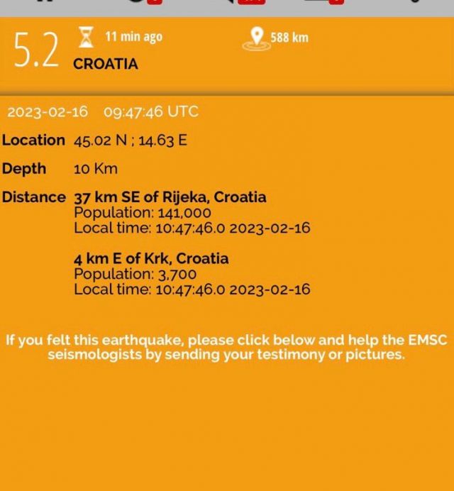 Një tërmet me magnitudë 5.2 i shkallës Rihter ka goditur sot Kroacinë, në orën 10:47.