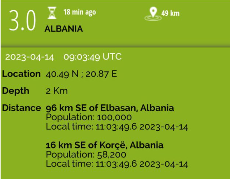 Mësohet se epiqendra e tërmetit ka qenë Elbasani, ndërsa goditjet janë ndjerë edhe në Korçë.
