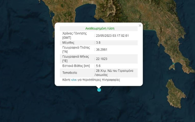 Një tërmet me magnitudë 3.8 Rihter ka goditur Greqinë mëngjesin e sotëm, 23 maj, rreth orës 06:17.