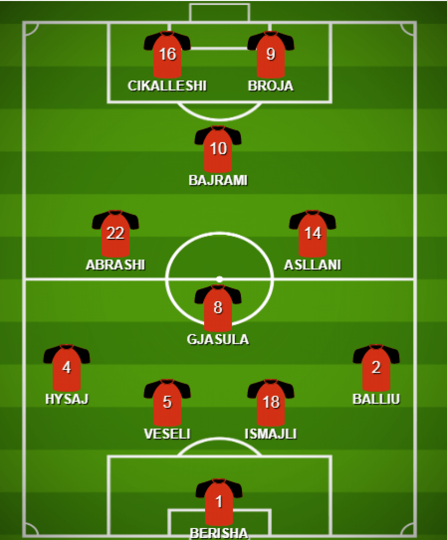 Në mesfushë titullarë pritet të luajnë Gjasula, Asllani e Abrashi, ndërsa Nedim Bajrami do të luajë pas dyshes sulmuese Sokol Cikalleshi-Armando Broja.