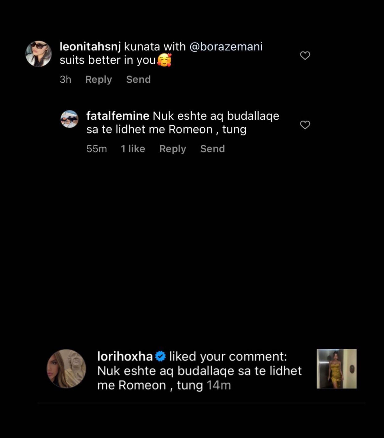 Në postimin e saj të fundit një ndjekës e komenton Lorin si “kunatë” me Bora Zemanin e cila është në një romancë me Donald Veshajn. Por dikush tjetër ka replikuar, duke shkruar: “Nuk është aq budallaqe sa të lidhet me Romeon, tung”