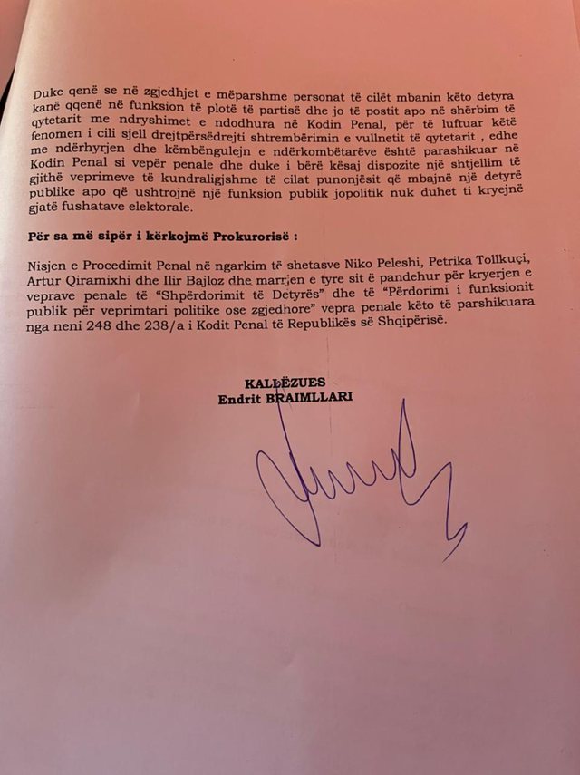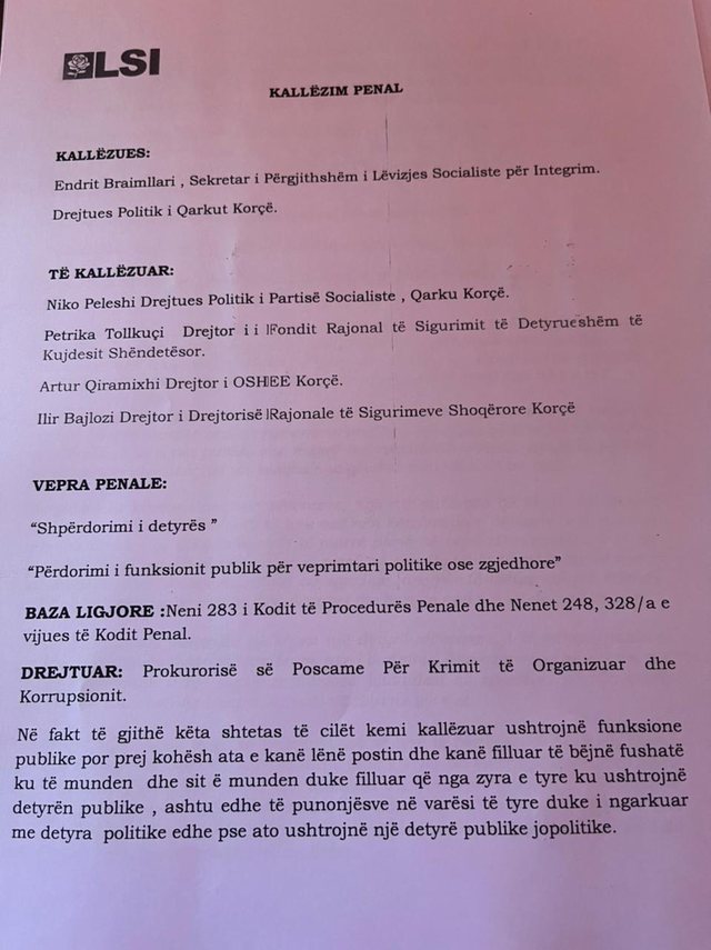 Kandidati i LSI-së për deputet në qarkun e Korçës, Endrit Braimllari, ka bërë kallëzim penal për kundërshtarin e tij politik, Niko Peleshi me akuzën e ‘Shpërdorimit të detyrës’.