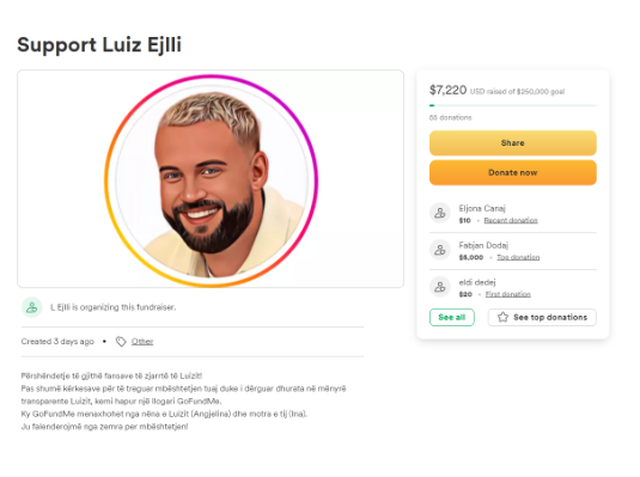 Ndërkohë, së fundmi, një familjar i tij, kunati, Sokol Tahiri ka njoftuar se është hapur një ‘Gofundme’ për të, i cili do të menaxhohet nga familjarët e Luizit.