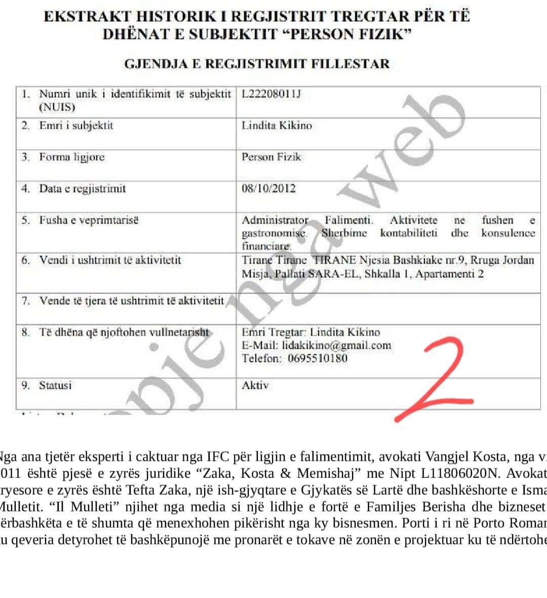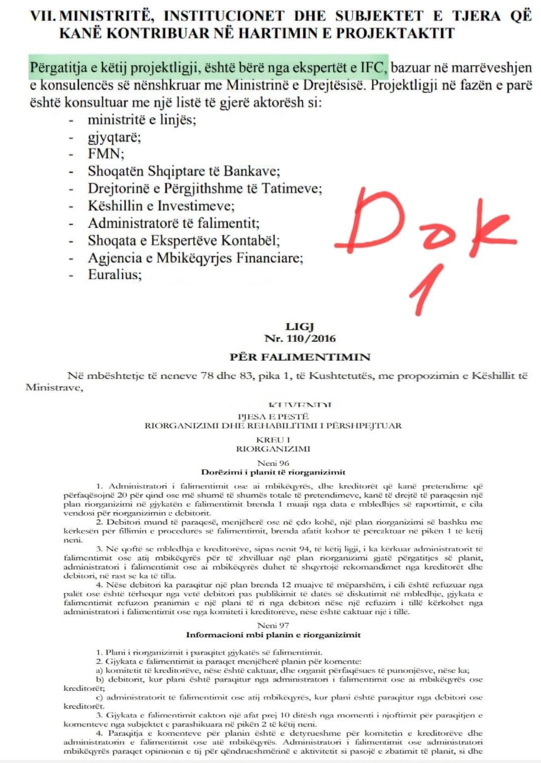 Nga ana tjetër eksperti i caktuar nga IFC për ligjin e falimentimit, avokati Vangjel Kosta, nga viti 2011 është pjesë e zyrës juridike “Zaka, Kosta & Memishaj” me Nipt L11806020N.