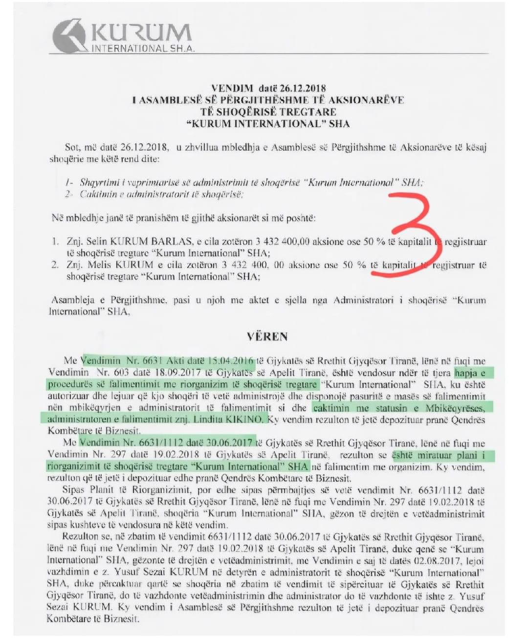 Me vendimin e datës 2-08-2017 u vendos kufizimi i veprimeve të administratorit Yusuf Sezai Kurum për transaksionet mbi 20 000 000 lekë, për shkak të “planit të riorganizimit”. Pjesë e këtij procesi të kalkuluar ishte edhe publikimi 5 vite më pas në QKB (20-04-2018) i kontratës noteriale Nr. 20283 datë 14-11-2013 për transferimin e aksioneve me anë të dhurimit nga pronari i Kurum.