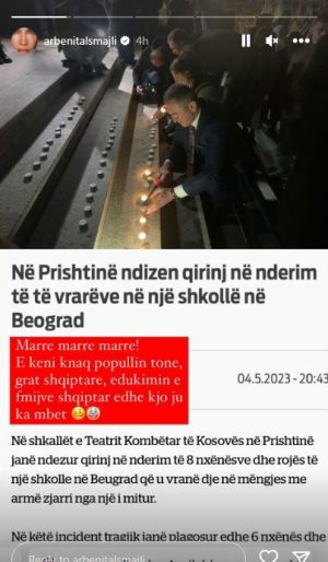 Modelja e njohur Arbenita Ismajli ka reaguar e revoltuar për sjelljen e qytetarëve në Kosovë pas masakrës me disa të vrarë në Serbi. Ajo ka ndarë në profilin e saj në Instagram një shkrim, që tregonte se në Prishtinë ishin ndezur qirinj për të përkujtuar të vrarët.