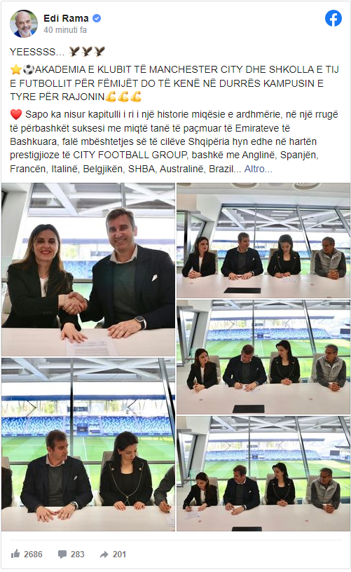 Sapo ka nisur kapitulli i ri i një historie miqësie e ardhmërie, në një rrugë të përbashkët suksesi me miqtë tanë të paçmuar të Emirateve të Bashkuara, falë mbështetjes së të cilëve Shqipëria hyn edhe në hartën prestigjioze të CITY FOOTBALL GROUP, bashkë me Anglinë, Spanjën, Francën, Italinë, Belgjikën, SHBA, Australinë, Brazilin, Uruguajin, Japoninë, Indinë dhe Kinën”, shkruan Rama në kanalet e komunikimit.