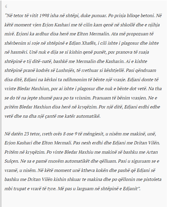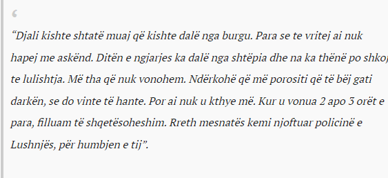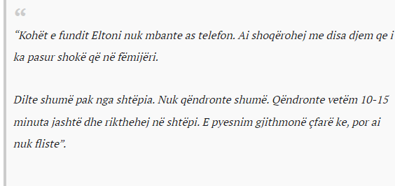 “Kohët e fundit Eltoni nuk mbante as telefon. Ai shoqërohej me disa djem qe i ka pasur shokë që në fëmijëri. Dilte shumë pak nga shtëpia. Nuk qëndronte shumë. Qëndronte vetëm 10-15 minuta jashtë dhe rikthehej në shtëpi. E pyesnim gjithmonë çfarë ke, por ai nuk fliste”.