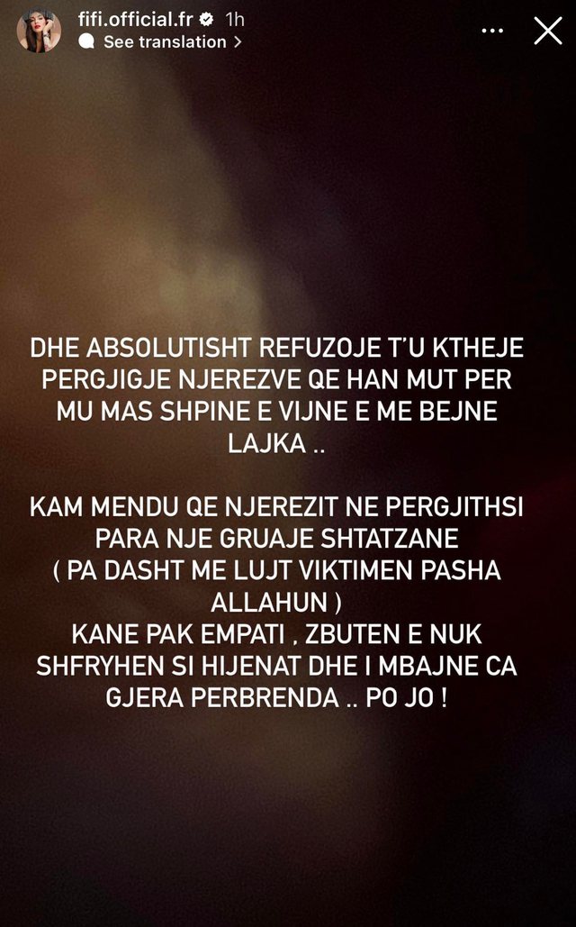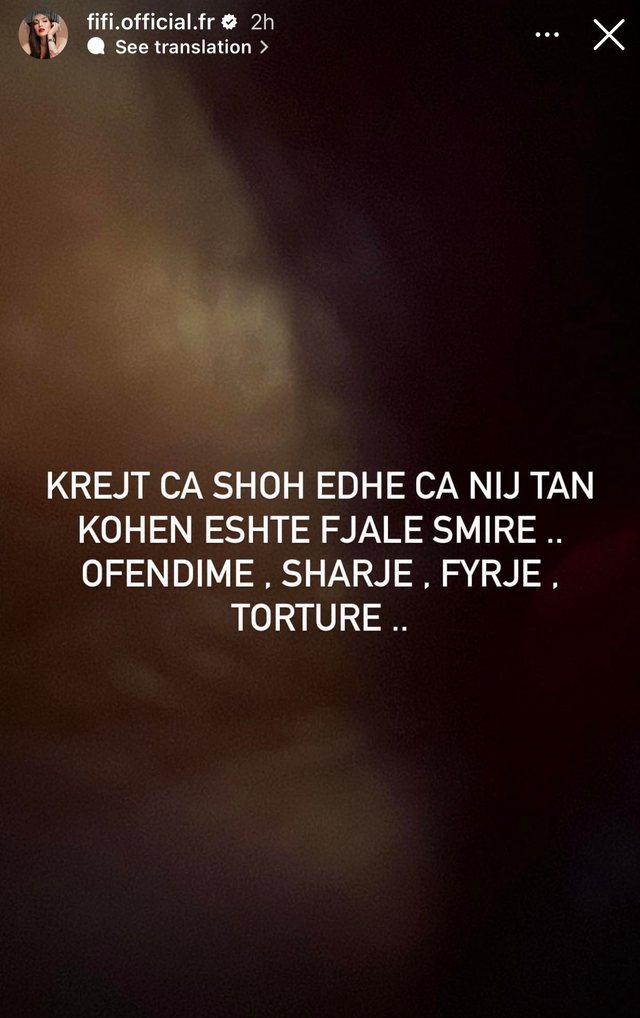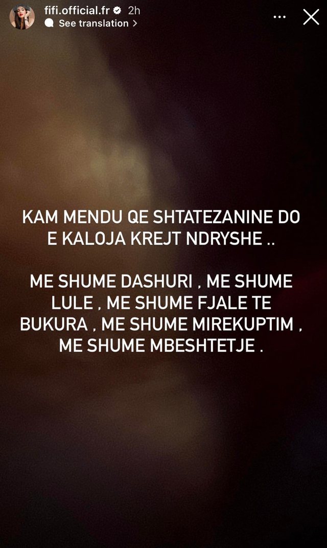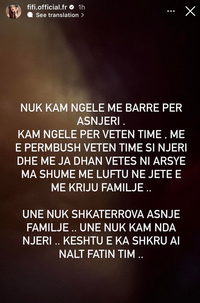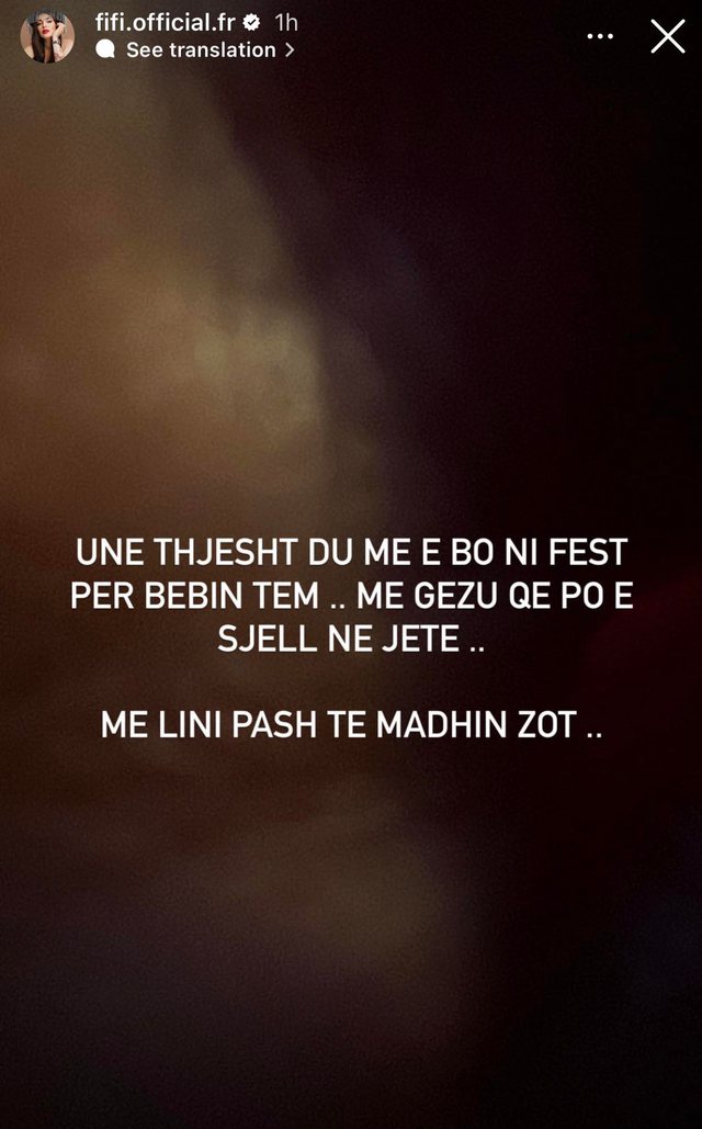 Teksa ndodhet në muajin e tetë të shtatzënisë, Fifi ka vendosur të shprehë të gjitha ndjesitë e akumuluara gjatë kësaj periudhe. Përmes një shkrimi në Instastory, këngëtarja ka treguar zhgënjimin që ka marrë nga njerëzit përgjatë muajve më të bukur të jetës së saj.