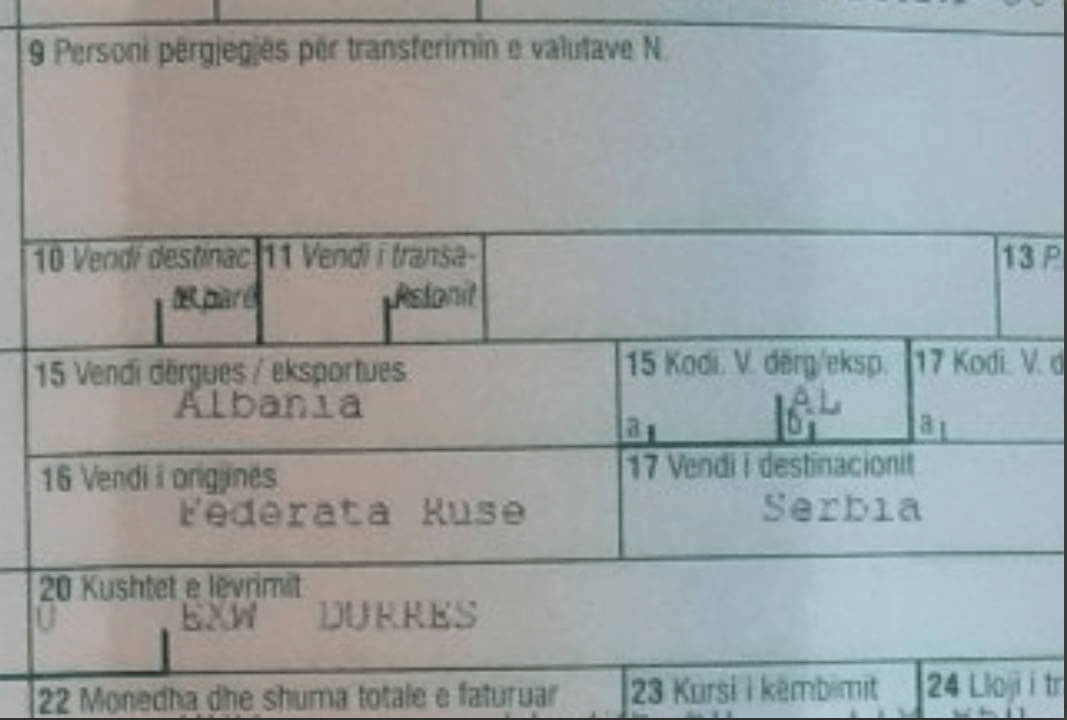 Për këtë sillet edhe një foto e një fature që dëshmon për futjen e mallit në Portin e Durrësit me origjinë nga Rusia dhe me destinacion Serbinë. Ajo që bie në sy në shkrim është edhe pjesa kur thuhet se thyerja e sanksioneve është zbuluar nga agjensitë e huaja perëndimore dhe tashmë prej 10 ditësh nuk ka më asnjë anije ruse në Portin e Durrësit.